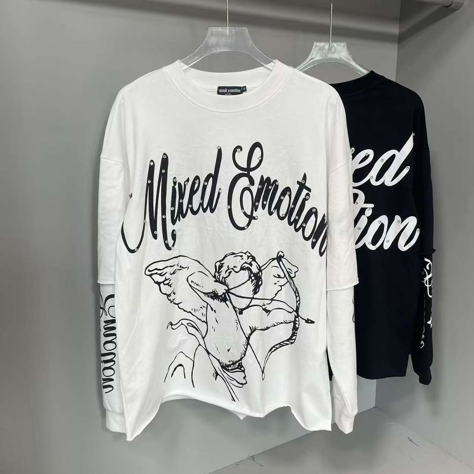 Custom Heavyweight Rhinestone 100% Cotton Hip Hop Men's Clothing Designer Cupid Tattoo Graphic Printing Mixed Emotions Long