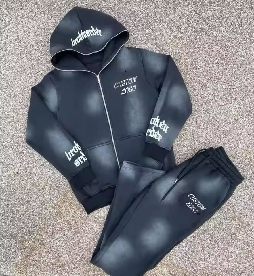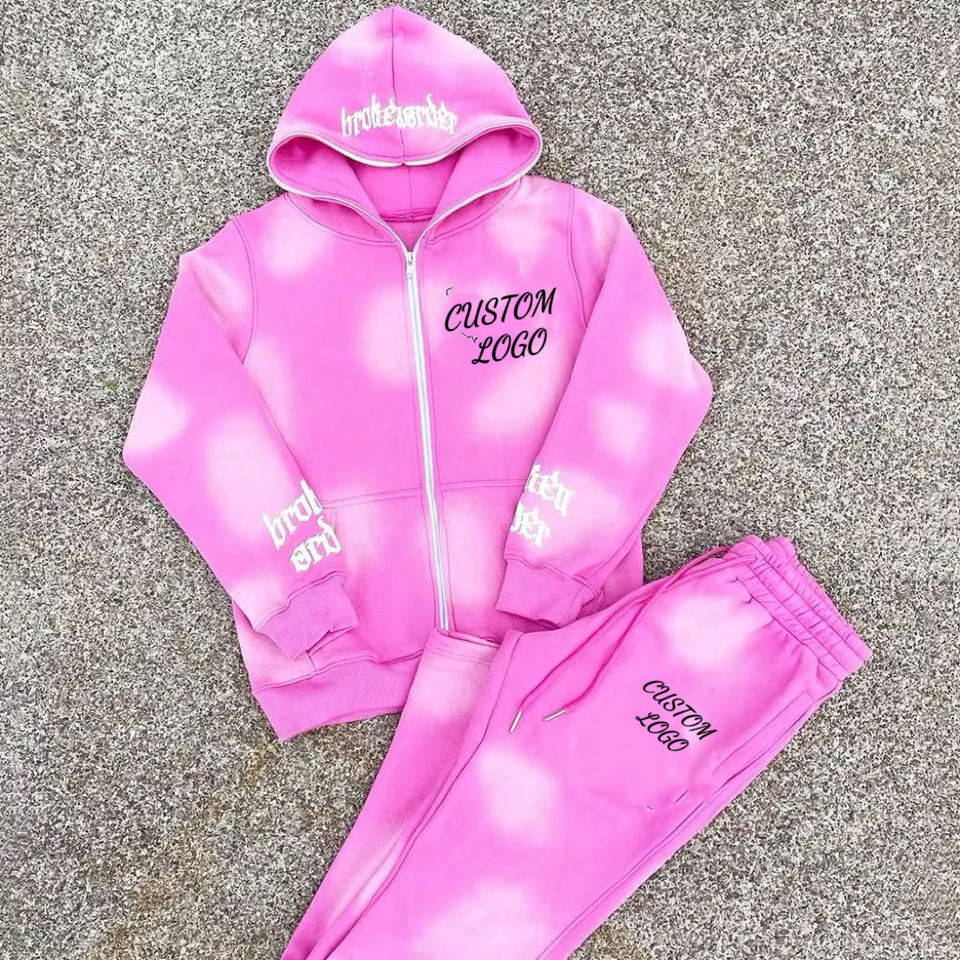 ชุดแทรคสูทสตรีทแวร์แบบย้อมสีเอซิดสั่งทำพิเศษ สำหรับกางเกงสเวตแพนท์พิมพ์ลายพัฟ และเสื้อฮู้ดซิปเต็มหน้า ระบายอากาศได้ดี ชุดออกกำลังกาย กางเกงทรงบาน