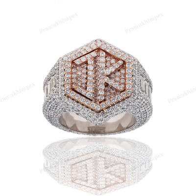 แหวนเพชรรูปหกเหลี่ยมเริ่มต้นแบบสั่งทำสีโรสโกลด์แหวนแบบลากและแบบบาแกตต์ตัดเพชรแหวนสไตล์ฮิปฮอปเครื่องประดับอินเทรนด์