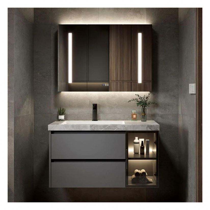 ตู้ห้องน้ำแบบแบนสีเทาเคลือบเงาสั่งทำพิเศษ พร้อมแผงประตูกระจกและดีไซน์อ่างล้างหน้าในตัว