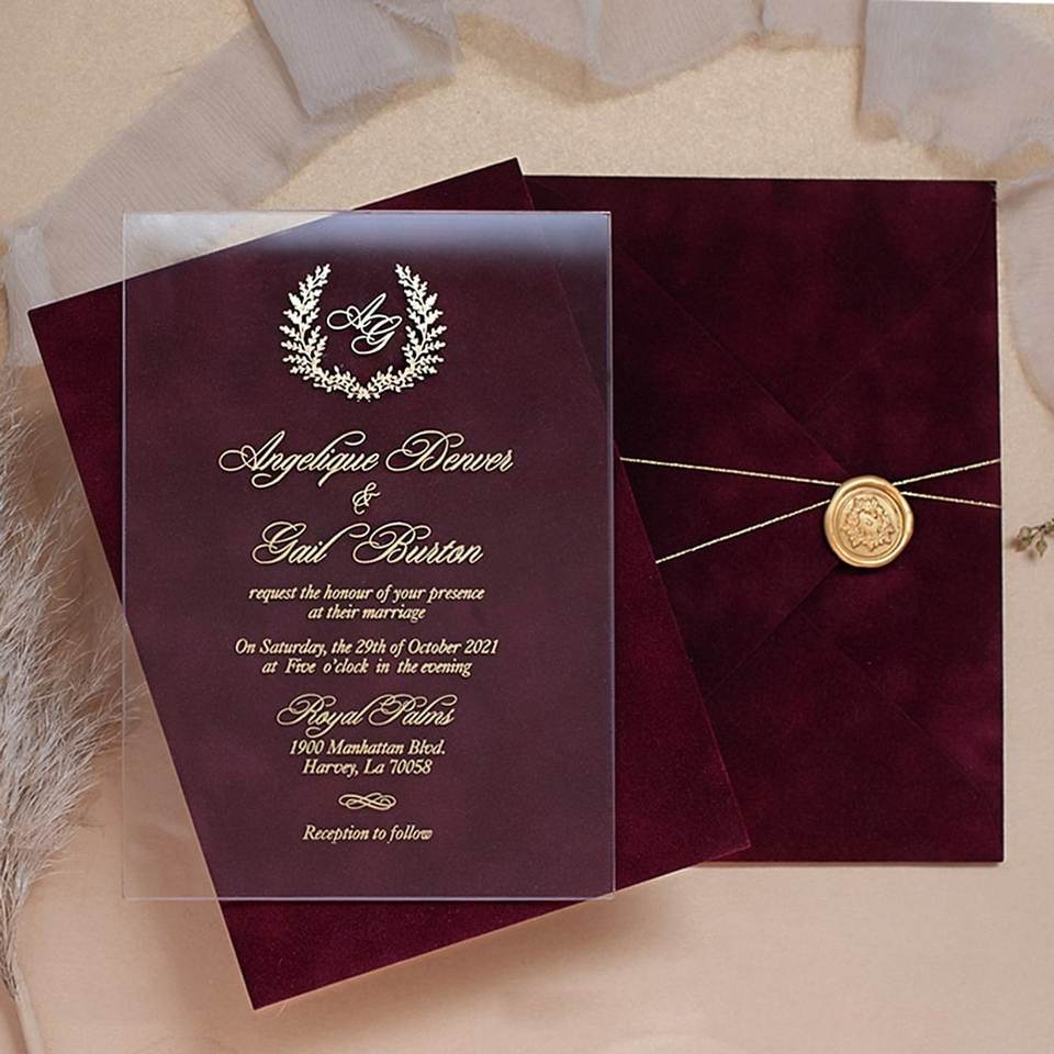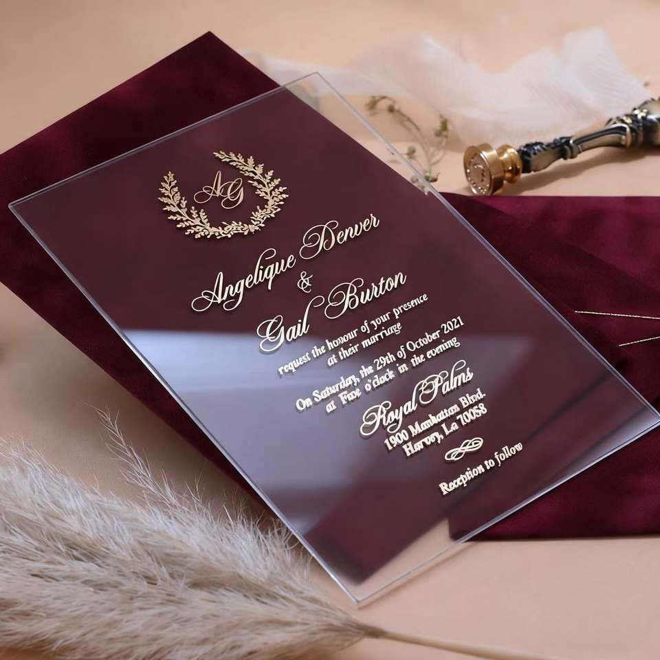 การ์ดเชิญงานแต่งงานพิมพ์ลายโลหะสแตนเลสสตีลระดับไฮเอนด์แบบกำหนดเอง พร้อมการ์ดขอบคุณแบบโปร่ง สำหรับโอกาสพิเศษ