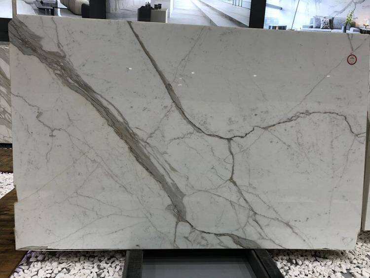 Calacatta ความเงางามสูงหินอ่อนสีขาวดีไซน์ทันสมัยขัดเงากันน้ำสำหรับเตาผิงล้อมรอบโต๊ะแผ่นติดผนัง