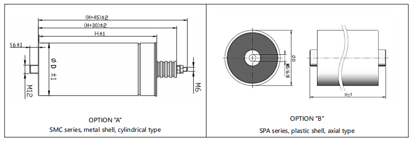 ตัวเก็บประจุฟิล์มโพลีโพรพิลีนแบบกำหนดเองชนิดกระบอก ซีรีส์ SMC/SPA สำหรับป้องกันกระแสกระชากสูง 1.0~50F 300~6000Vac CABO