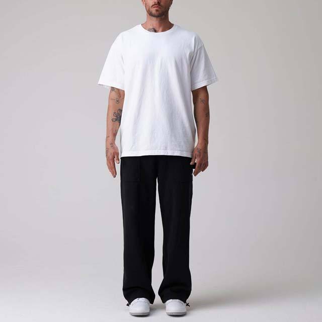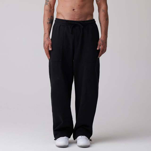 กางเกงสเวตเตอร์ผ้าคอตตอนสีดำขากว้างแบบลำลองเอวยางยืดสำหรับผู้ชายทรงหลวมลายทางทรงตรงแบบกำหนดเอง