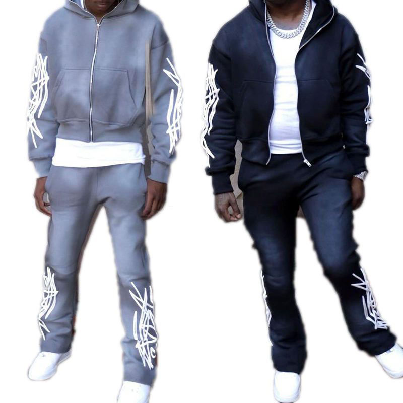 ชุดวอร์มผ้าฝ้ายคุณภาพสูงแบบกำหนดเอง กางเกงวอร์มและเสื้อฮู้ดดี้สำหรับผู้ชาย ชุดสตรีทแวร์ลายฟอกสี ชุดวอร์มสไตล์แก๊งสเตอร์