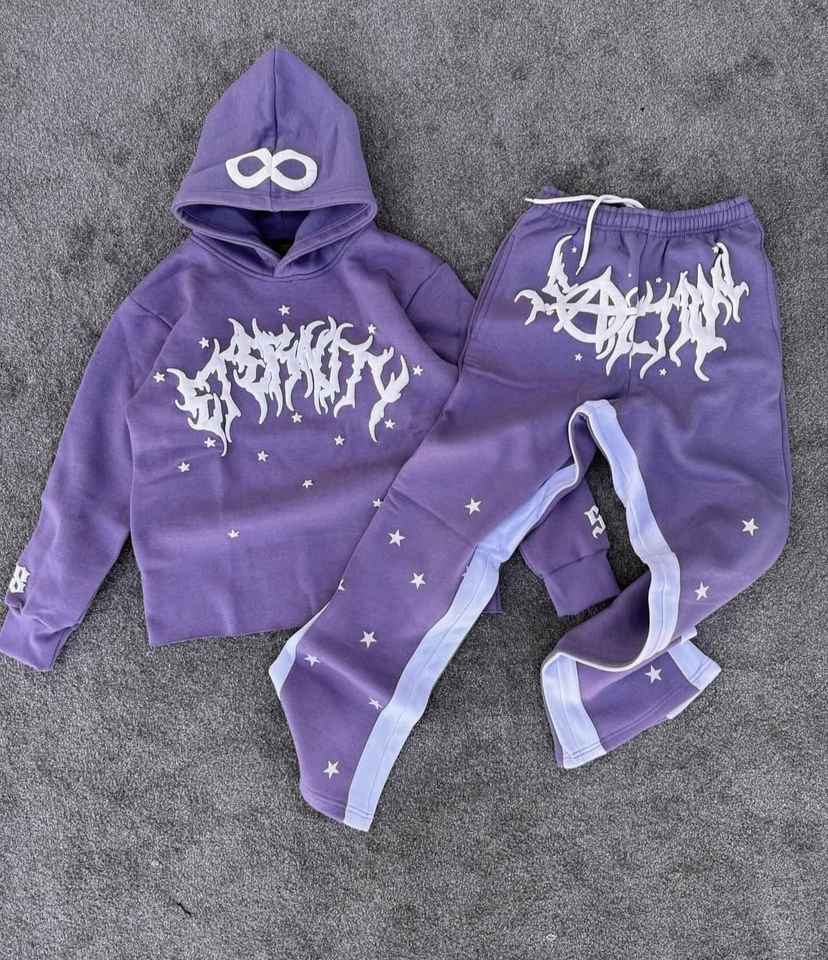 ชุดเซ็ตเสื้อฮู้ดดี้และกางเกงวอร์มทรงขาบาน ผ้าหนา 220 กรัม ลุคย้อนยุค ซักฟอกแบบ Acid Wash สำหรับผู้ชาย คุณภาพสูง