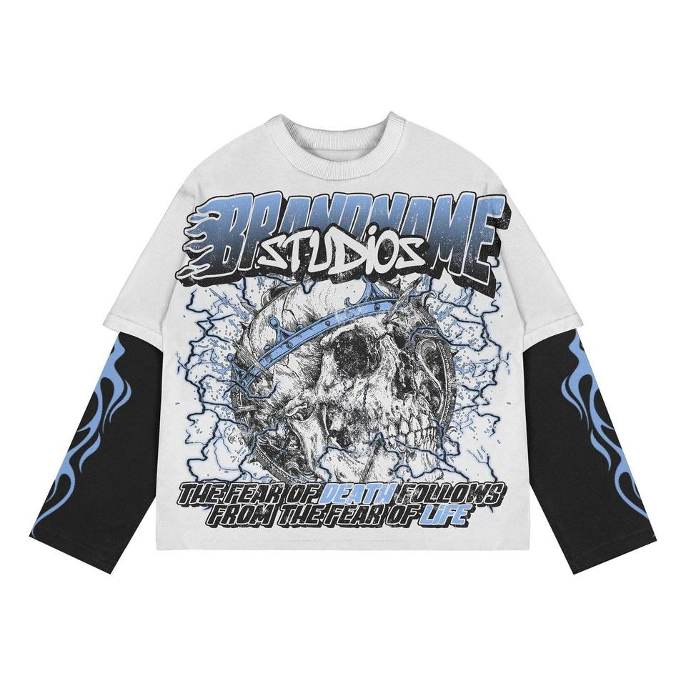 เสื้อยืดสตรีทแวร์คุณภาพสูงแบบสั่งทำพิเศษ ลายกราฟิกพิมพ์เต็มตัว แขนเสื้อแบบสองชั้นลายเปลวไฟ เสื้อยืดแขนยาวสองชั้น
