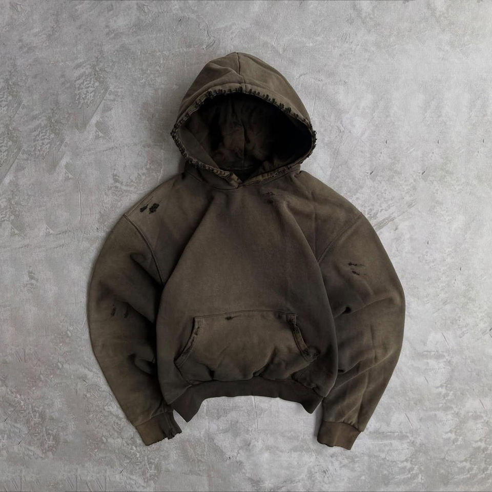 เสื้อฮู้ดดี้ผ้าฝ้าย 100% คุณภาพสูง ปักลายแบบดิสเทรส แต่งสีพ่น ปะติดเพชร ดีไซน์ขอบดิบ ซักแบบแซนด์วอช