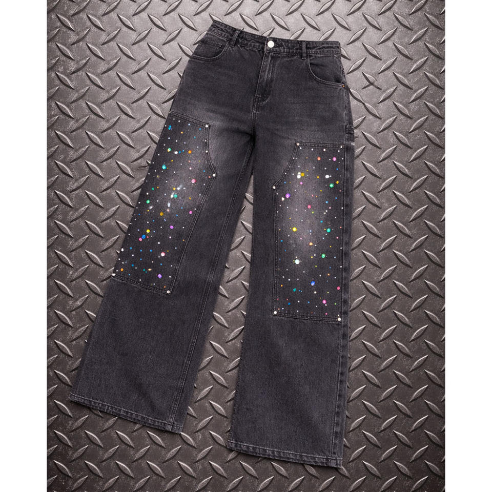 กางเกงยีนส์เดนิมผ้าฝ้ายคุณภาพสูงแบบหนา ซักย้อมสีเอซิด ประดับคริสตัล สไตล์สตรีทแวร์ ไซส์พลัส ทรงเข่าคู่ สำหรับผู้ชาย