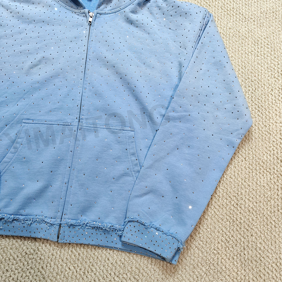 เสื้อฮู้ดผู้ชายโอเวอร์ไซส์ซักกรดสีฟ้าผ้าฝ้ายเทอร์รี่400 GSM มีซิปรูดพลอยเทียม