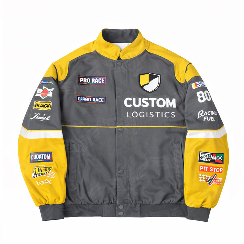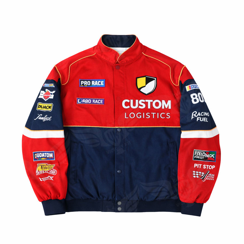 Men's Custom Racing Jacket Embroidered Patches Motorsport Bomber Coat Black Purple Snap Button Streetwear OEM Logo Wholesale