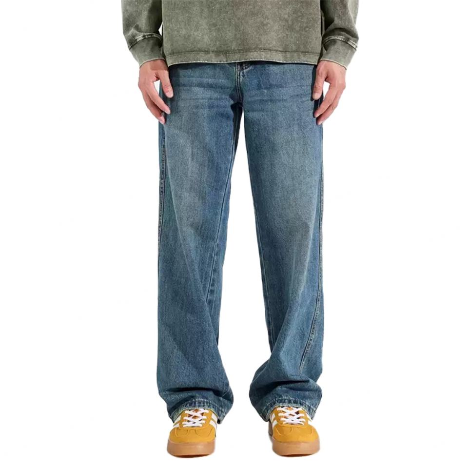 กางเกงยีนส์คุณภาพสูงสำหรับผู้ชาย สีน้ำเงินฟอก ผ้าฝ้ายวินเทจ ทรงตรงเข้ารูป กางเกงเดนิมทรงสลิม กางเกงขายาว กางเกงยีนส์ผู้ชาย