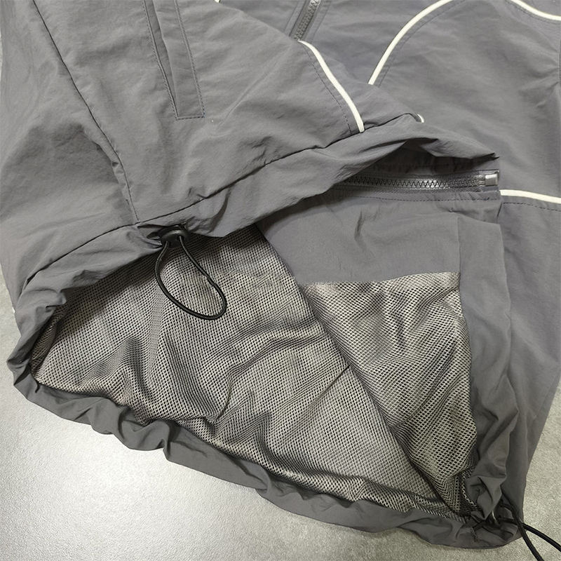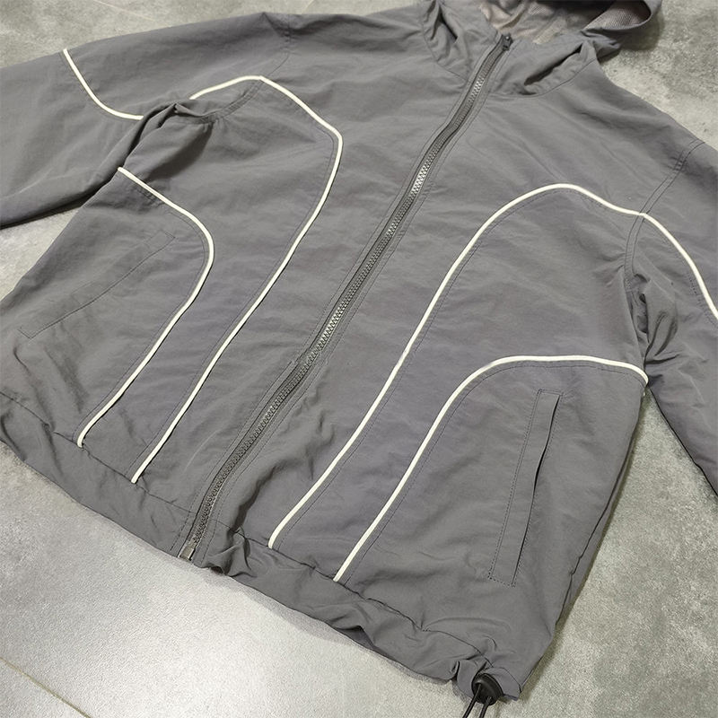 ชุดวอร์มกันลมคุณภาพสูงสำหรับผู้ชาย ผ้าไนลอนโพลีเอสเตอร์ แบบมีซิป แจ็คเก็ตมีฮู้ด และกางเกงขายาว พร้อมสายรัด
