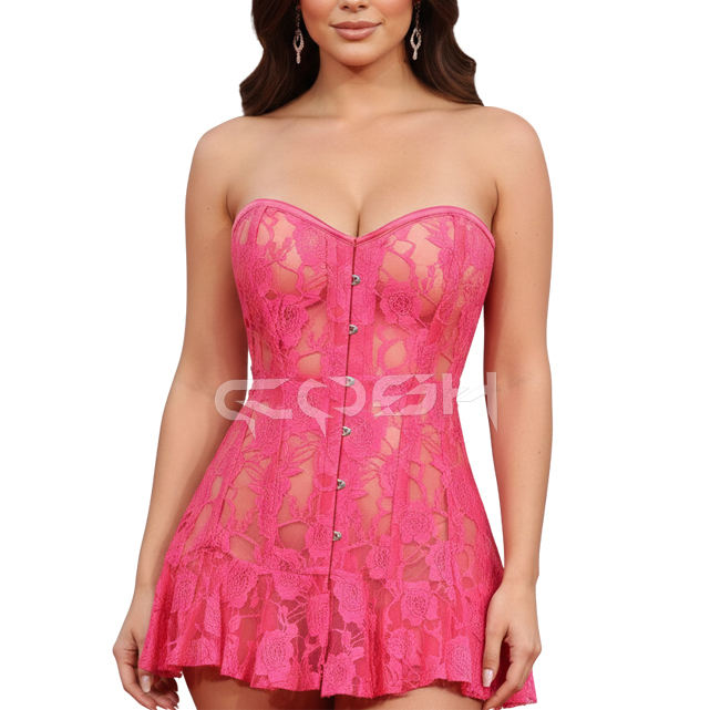 ชุดคอร์เซ็ทลูกไม้สีชมพูร้อนแรงคุณภาพสูงแบบสั่งทำพิเศษ พร้อมโครงเหล็กเสริมทรงและผ้าตาข่ายลายดอกไม้ ปิดด้านหน้าด้วยบัสค์