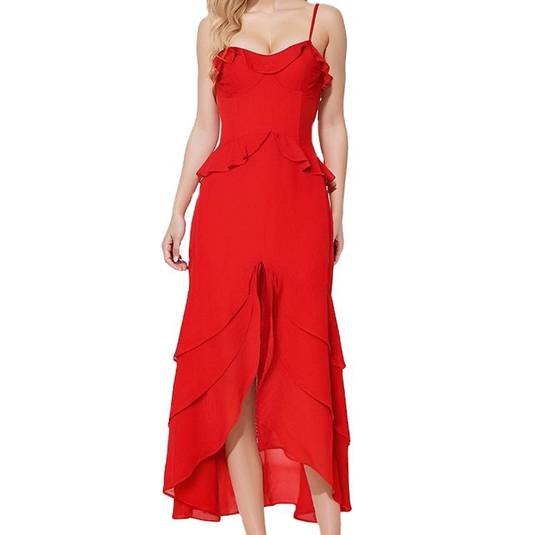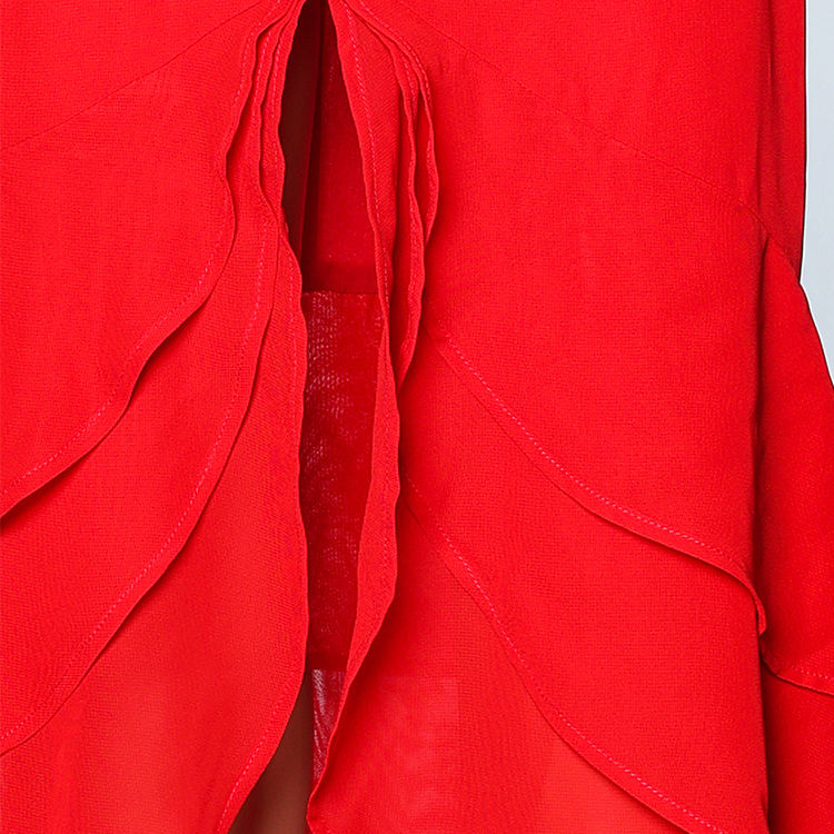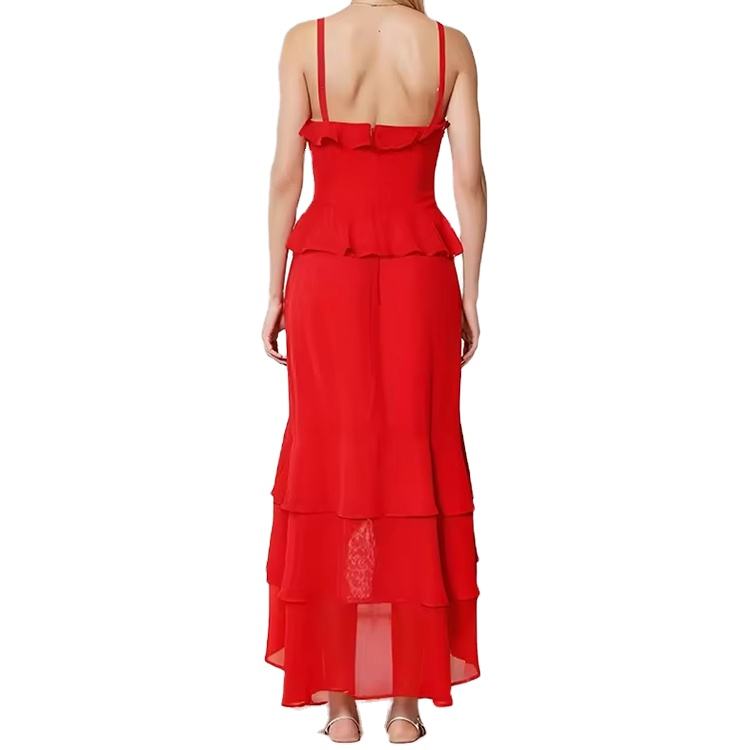 เดรสยาวผ้าชีฟองสีแดงระบายพิมพ์ลายคุณภาพสูงสำหรับฤดูใบไม้ผลิและฤดูร้อน สไตล์ลำลอง แฟชั่นหรูหราสำหรับสุภาพสตรี