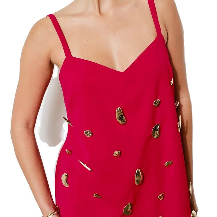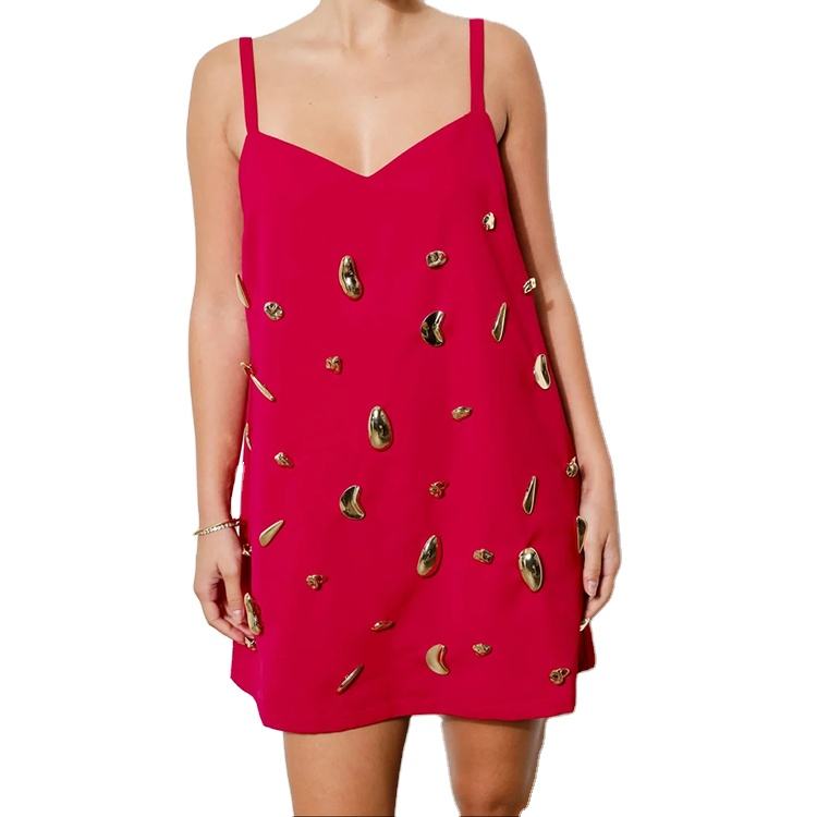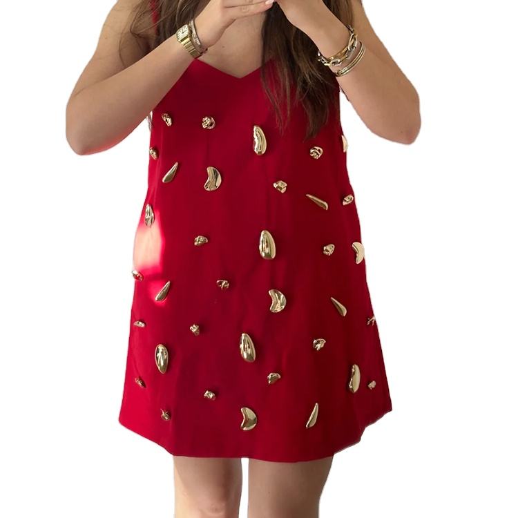 Custom High Quality Spring Summer Casual Elegant Red Spaghetti Strap Gold Metallic Embellishment V-Neck Casual Party Dress