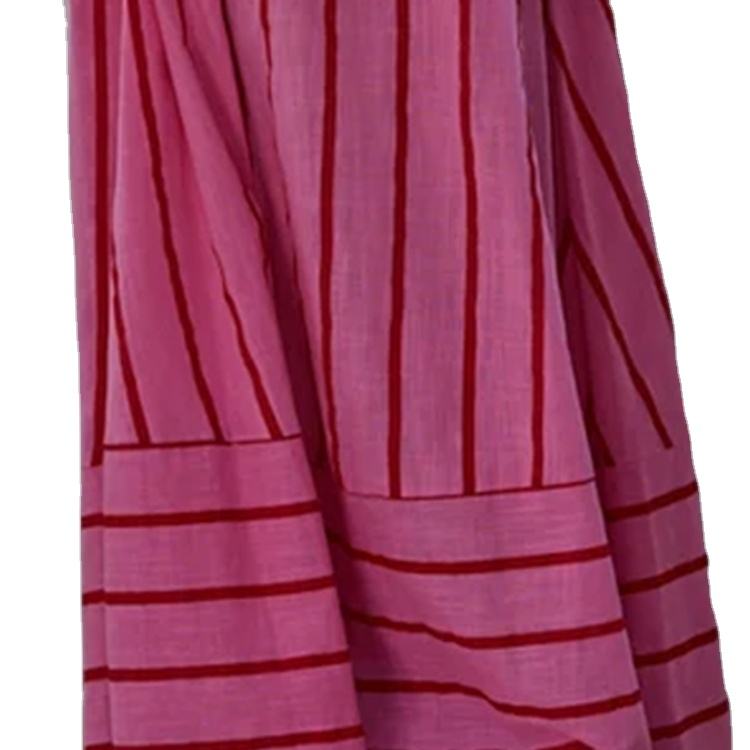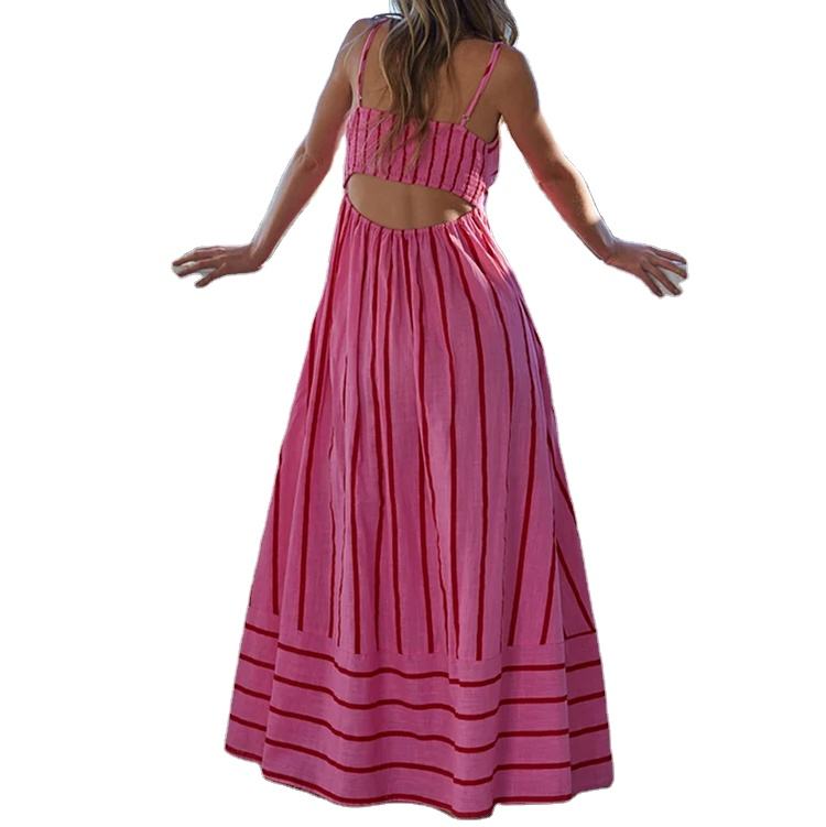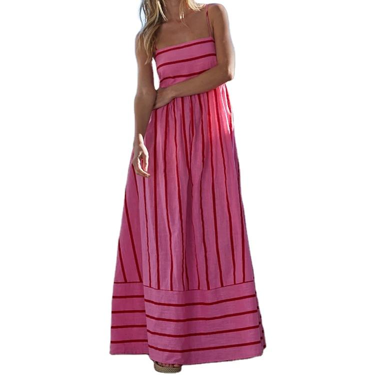 ชุดเดรสลำลองลายทางสีชมพูแดงคุณภาพสูงสำหรับฤดูใบไม้ผลิและฤดูร้อน สายเดี่ยวแบบสปาเก็ตตี้ เหมาะสำหรับใส่ไปเที่ยวชายหาด