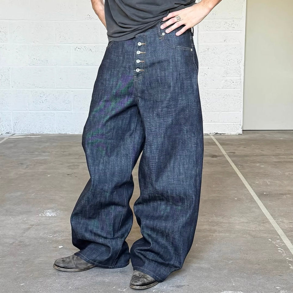 กางเกงยีนส์เดนิมวินเทจคุณภาพสูงสั่งทำพิเศษสำหรับผู้ชาย สไตล์สตรีทแวร์ ทรงบู้ทคัทหลวมๆ ติดกระดุม เหมาะสำหรับฤดูหนาว