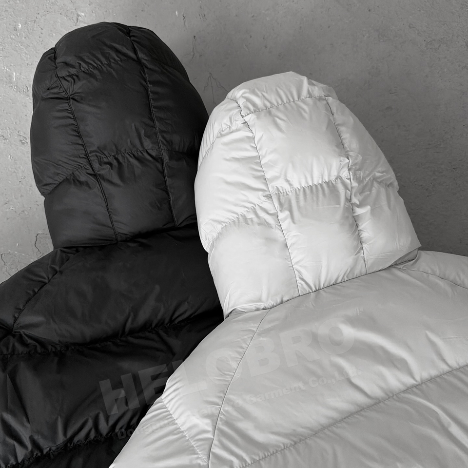 เสื้อแจ็คเก็ตพัฟเฟอร์ผู้ชายคอตั้งบุใยคุณภาพสูงแบบสั่งทำพิเศษ ทรงโอเวอร์ไซส์ ผ้าแคนวาสกันลม สำหรับฤดูหนาว ป้องกันแบคทีเรีย มีโลโก้ด้านหน้าแบบมีฮู้ด