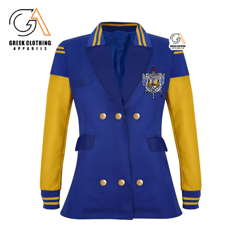 เสื้อเบลเซอร์สีทองแบบกระดุมสองแถว คุณภาพสูงสั่งตัดพอดีตัว พร้อมกระดุมสีทอง สำหรับงานธุรกิจหรืองานสังสรรค์ของชมรม Sigma Gamma Rho ที่ให้ความสง่างาม