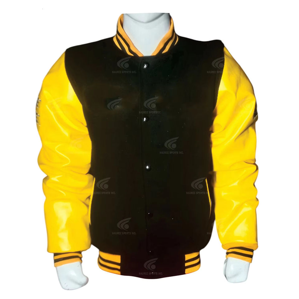 แจ็กเก็ตแนวสตรีทผู้ชายสำหรับฤดูหนาวเสื้อแจ็คเก็ตกันลมแบบตัวหนังสือผ้าวูลคุณภาพระดับพรีเมียม100% แขนเสื้อหนังแท้