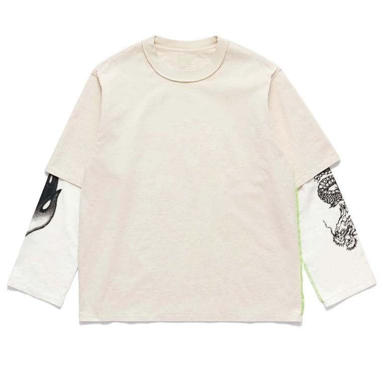 เสื้อยืดแขนยาวผู้ชายทรงโอเวอร์ไซส์ผ้าคอตตอน 100% พิมพ์ลายฮิปฮอปแบบสองชั้น สไตล์สตรีทแฟชั่น