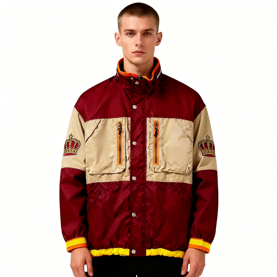 เสื้อแจ็คเก็ตกันลมสีสันตัดกันสไตล์สตรีทแวร์สำหรับผู้ชาย ปักโลโก้รูปมงกุฎ กันน้ำ แนวเทคแวร์ แบบทหาร