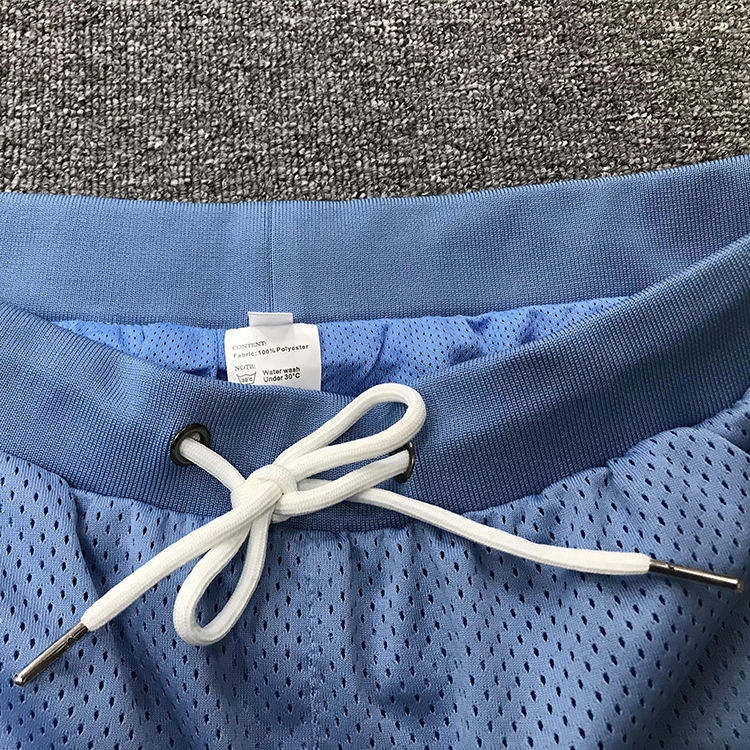 กางเกงขาสั้นกีฬาสไตล์สตรีทปรับแต่งได้สีฟ้าระบายอากาศได้ดีบาสเก็ตบอลถักไซส์ใหญ่เอวกลางยางยืดมีดีไซน์พิมพ์ลาย