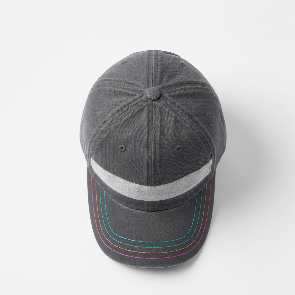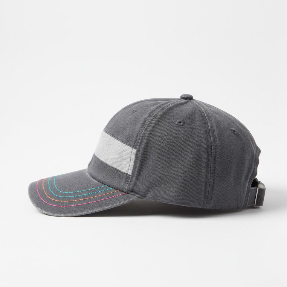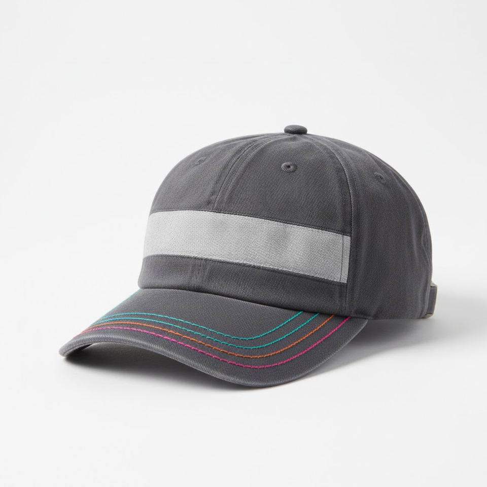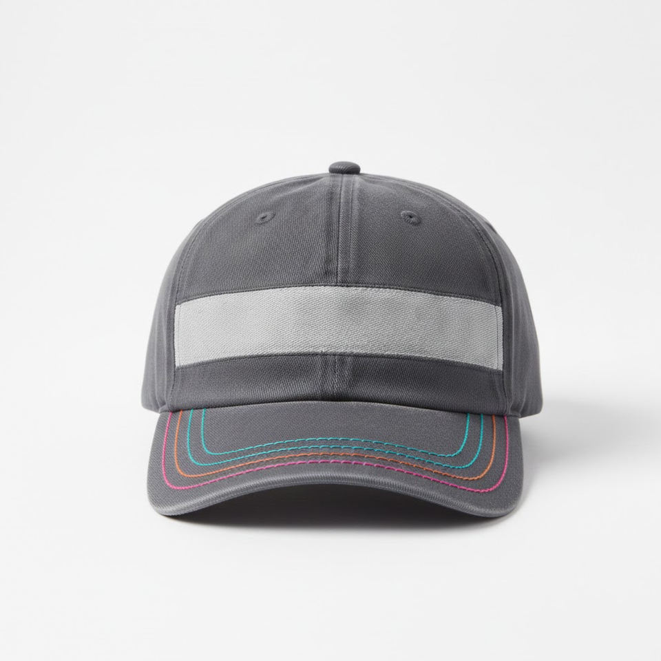 หมวกเบสบอลทรงสปอร์ตแถบสะท้อนแสงแบบกำหนดเองได้ 6 แผง ระบายอากาศได้ดี สวมใส่สบาย ผ้าฝ้ายสีเทา ปีกหมวกหลากสี