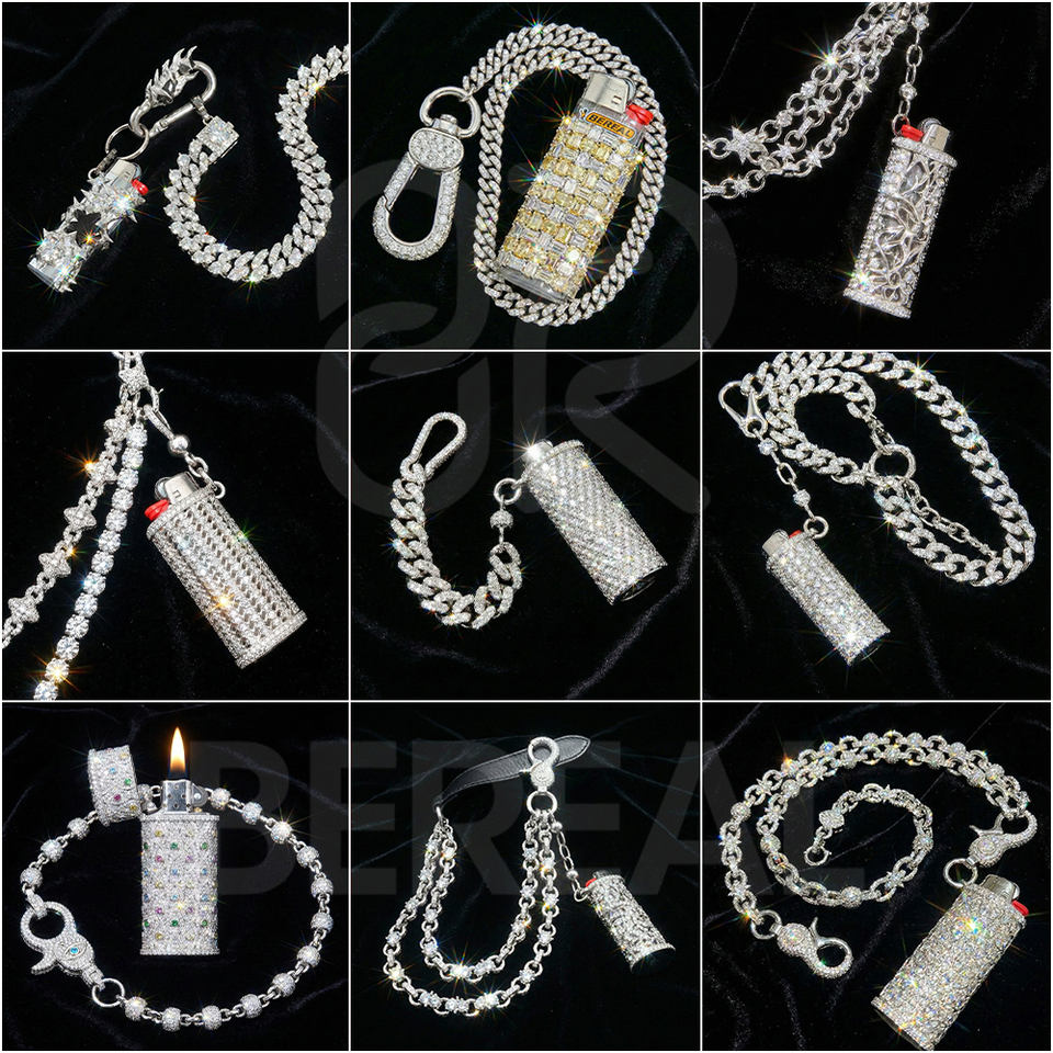 กระเป๋าสตางค์แบบมีโซ่ประดับเพชรโมอิสซาไนต์ VVS สไตล์ฮิปฮอป ผ่านการทดสอบเพชร เงินแท้ 925 พร้อมจี้ห้อยรูปไฟแช็ก งานจิวเวลรี่คุณภาพสำหรับผู้ชาย