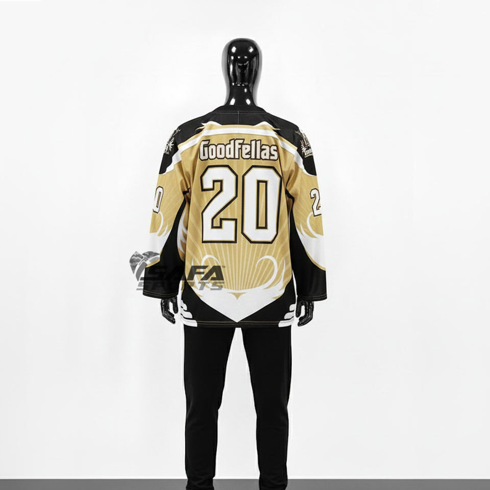 เสื้อฮอกกี้น้ำแข็งแบบกำหนดเองสำหรับเด็กและผู้ใหญ่ แบบเปล่า แบบซับลิเมชั่น แบบกลับด้านได้ แบบเย็บปักถักร้อยสีทอง