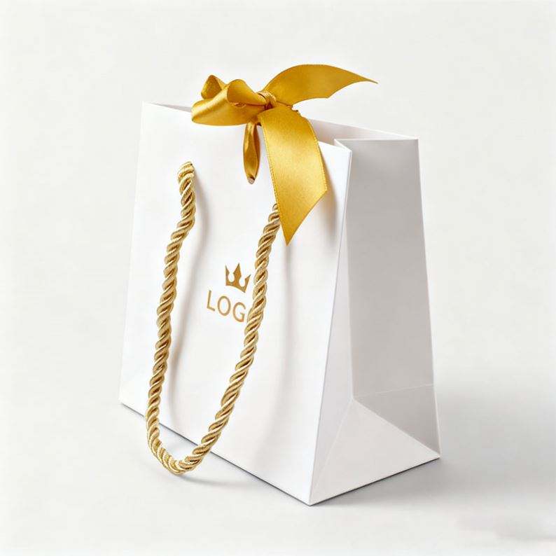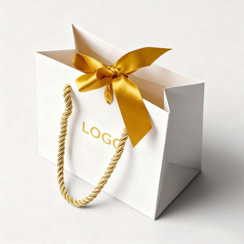 ถุงกระดาษช้อปปิ้งสีขาวพิมพ์โลโก้ฟอยล์ทองแบบกำหนดเอง พร้อมริบบิ้น