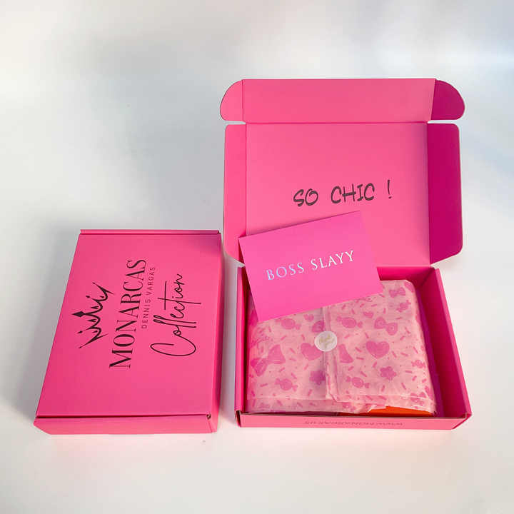 กล่องไปรษณีย์ลูกฟูกสีชมพูสดแบบกำหนดเอง พร้อมพิมพ์สีดำทั้งสองด้าน สำหรับบรรจุภัณฑ์เสื้อผ้าแบรนด์ดัง สำหรับอีคอมเมิร์ซ