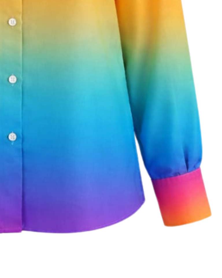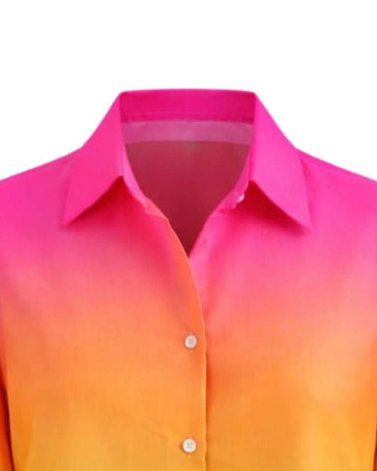เสื้อเชิ้ตผู้หญิงแขนยาวสีชมพูร้อนไล่เฉดสีเหลืองน้ำเงินแบบออมเบร ติดกระดุม สไตล์ลำลองสำหรับใส่ทำงาน ผู้ผลิตเสื้อผ้าแบบ OEM รับผลิตตามสั่ง