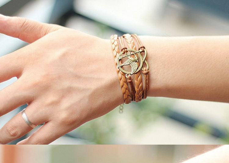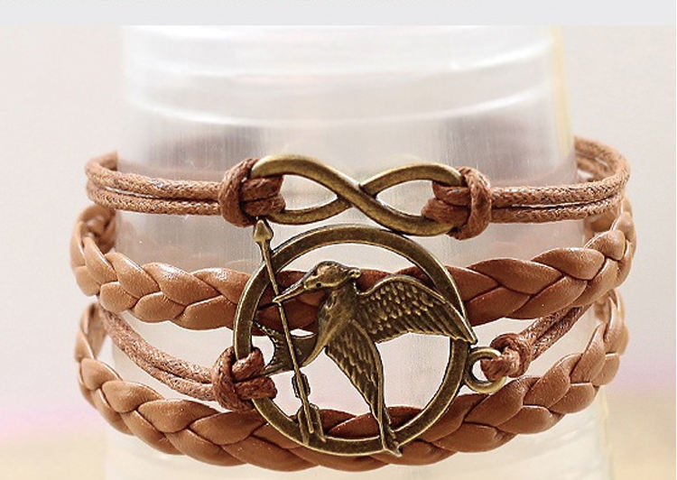 กำไลข้อมือหนัง PU สไตล์วินเทจ ลายล้อเลียนจาก Hunger Games พร้อมจี้รูปนก คิวปิด ลูกศร ความรัก และ Mockingjay สำหรับผู้ชาย - บริการดรอปชิป