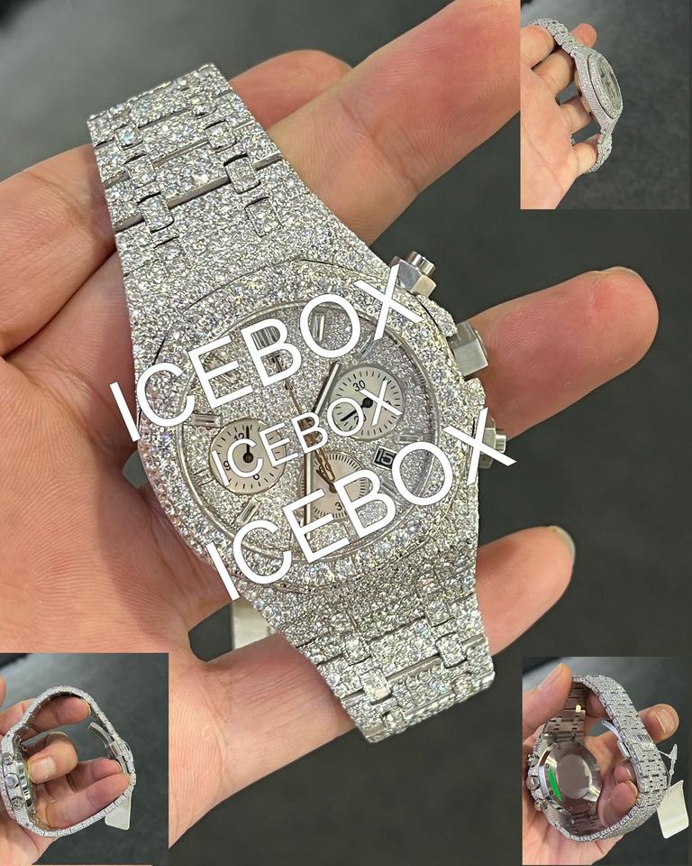 นาฬิกาข้อมือดิจิตอลสแตนเลสสตีลแบบมีสายรัดพร้อมตัวล็อคแบบฮิปฮอป ฝังเพชรโมอิสซาไนต์ VVS สองสี กันน้ำได้ 10 บาร์ ตัวเรือนแบบ Iced-Out สั่งทำพิเศษ