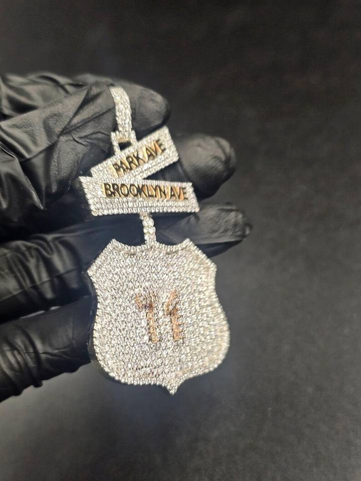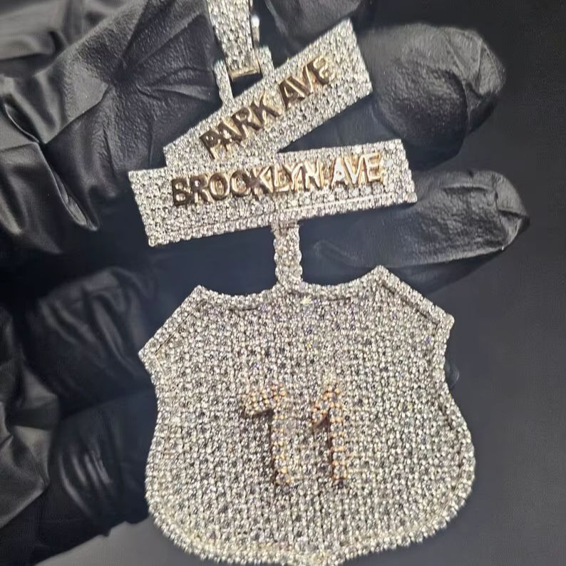 จี้ป้ายถนนแบบกำหนดเอง ประดับเพชรโมอิสซาไนต์ ชุบทองคำขาว เงินสเตอร์ลิง รูปทรงโล่ห์ ชื่อบรู๊คลิน เครื่องประดับชั้นดี