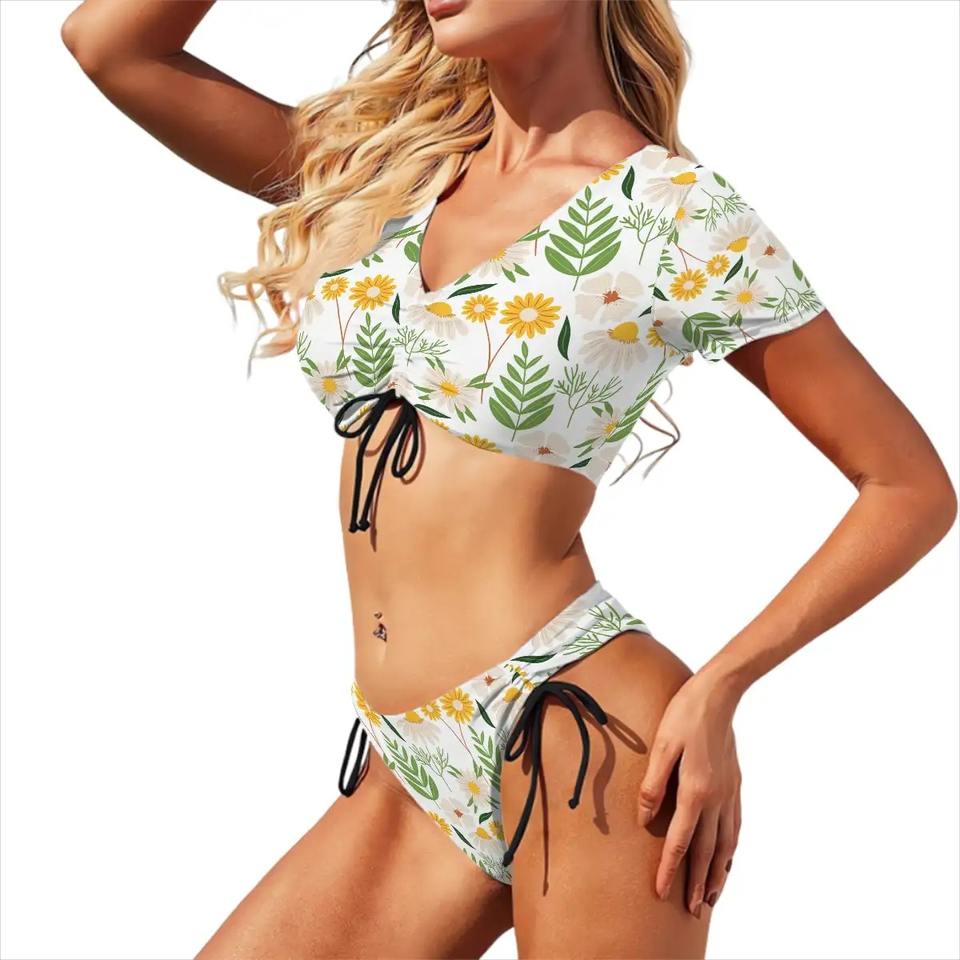 ชุดบิกินี่แบบผูกด้านหน้า แขนสั้น ลายดอกไม้ ผ้าไมโครไฟเบอร์ ระบายอากาศได้ดี ไซส์พลัส พิมพ์ลายดิจิทัลแบบสองด้าน สำหรับใส่เล่นน้ำ