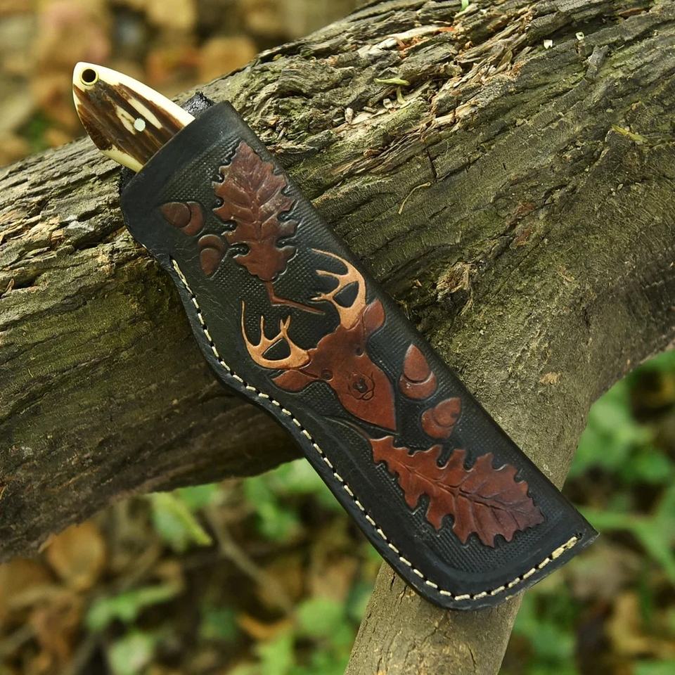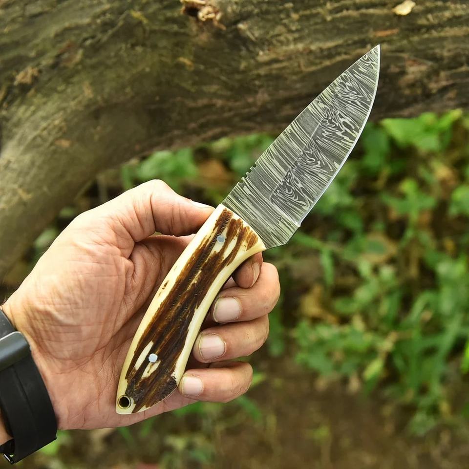 มีดเหล็กดามัสกัสเกรดอุตสาหกรรมแบบกำหนดเอง ด้ามจับทำจากเขาสัตว์ แบบฟูลแทง ดรอปพอยต์อเนกประสงค์ สำหรับตั้งแคมป์กลางแจ้ง