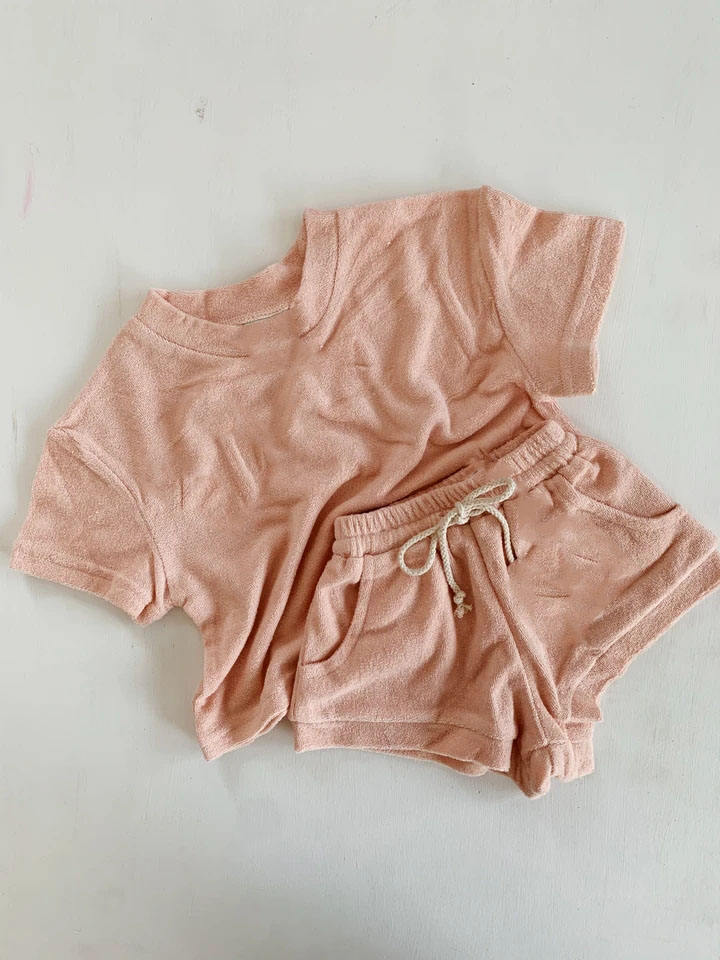 ชุดเสื้อผ้าเด็กอ่อนสำหรับฤดูร้อน ผ้าเทอร์รี่ ชุดเสื้อแขนสั้นสำหรับเด็กชายและเด็กหญิง เนื้อผ้านุ่ม