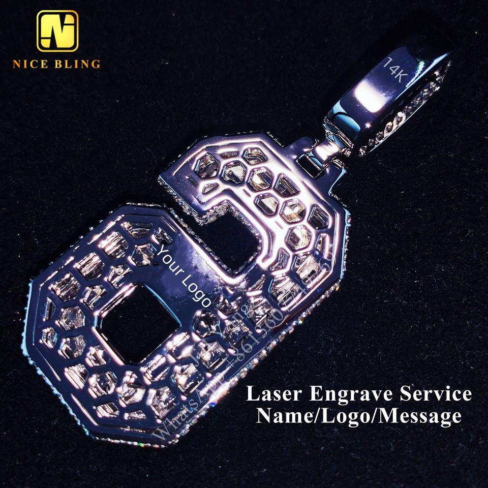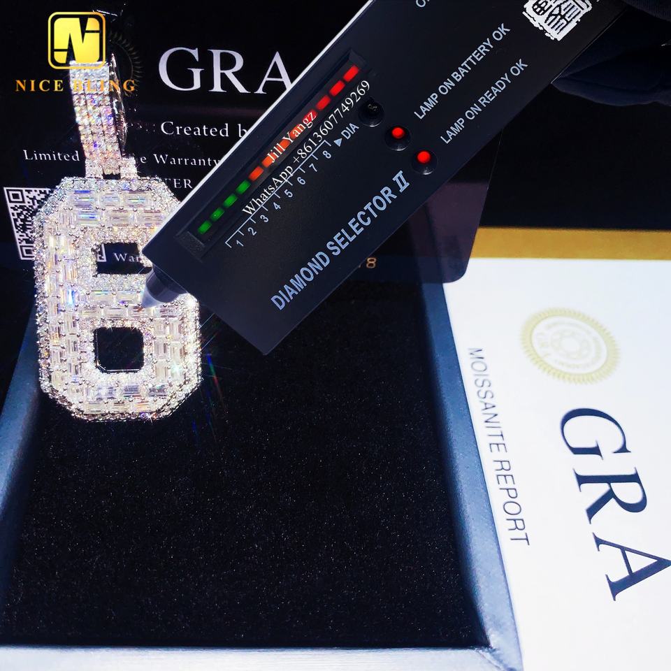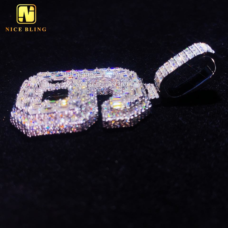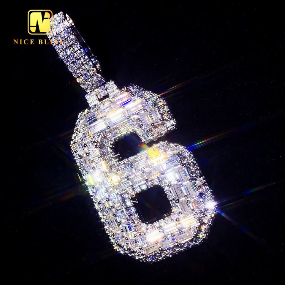 ผู้ผลิตเครื่องประดับตามสั่ง จี้เพชรทรงตัวเลขแบบกำหนดเอง จี้เพชรโมอิสซาไนต์ทรงบาแก็ตต์ 6 เม็ด เครื่องประดับแบบ Iced Out สร้อยคิวบัน ฮิปฮอป ร็อค