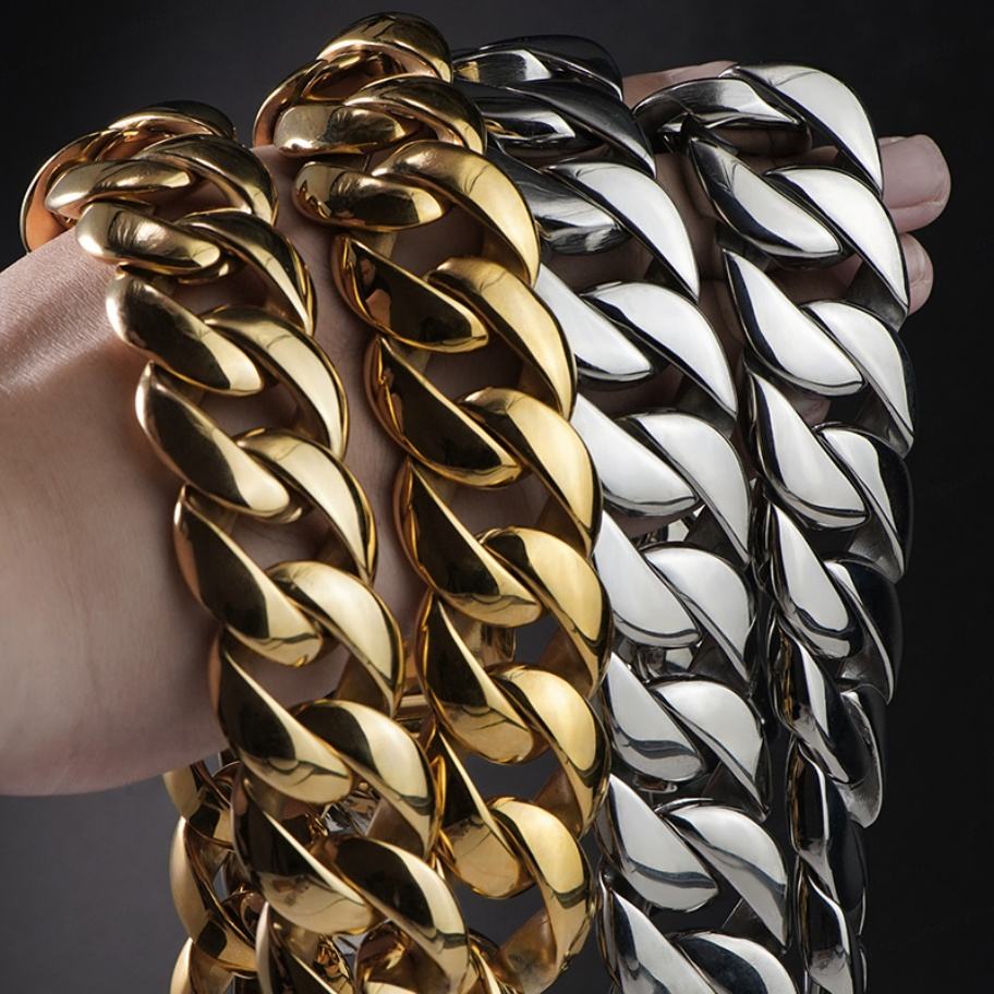ผู้ผลิตเครื่องประดับตามสั่ง สร้อยคิวบันเชน สแตนเลส หน้ากว้าง 30 มม. หนัก ทนทาน เคลือบทอง 18K PVD สไตล์ไมอามี่ ฮิปฮอป สำหรับงานปาร์ตี้