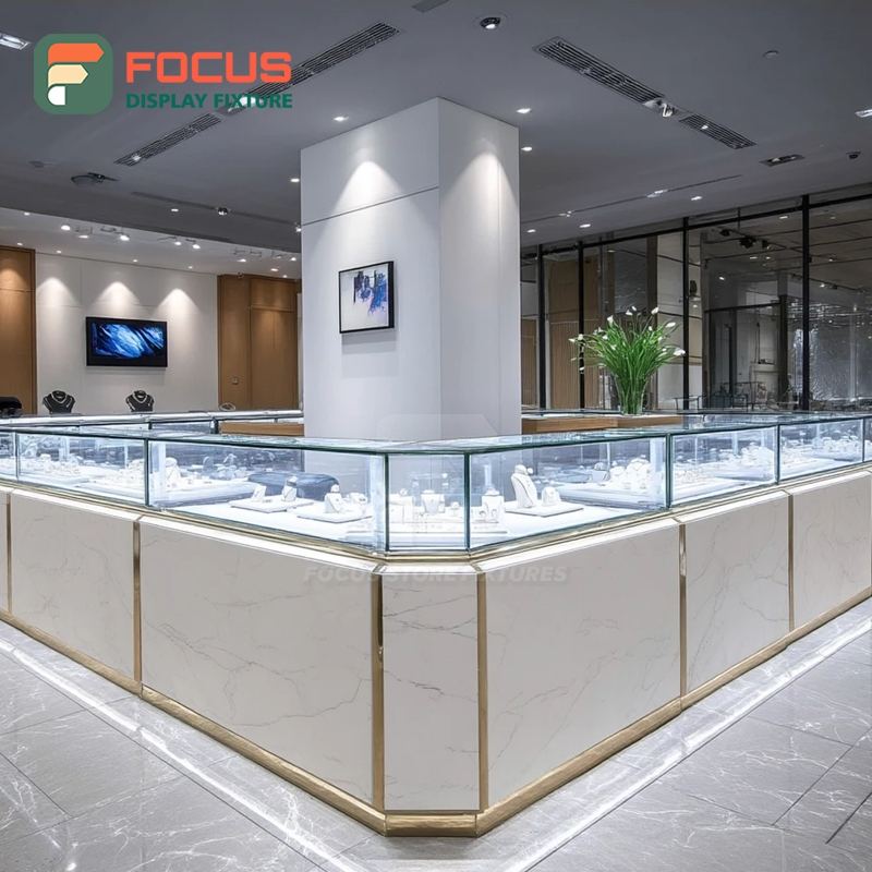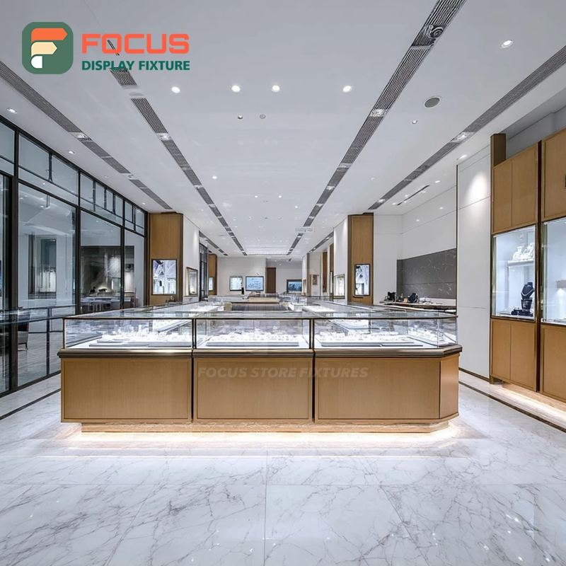 ระบบจัดแสดงเครื่องประดับแบบกำหนดเอง ตู้โชว์ร้านค้าแบรนด์ดังพร้อมโครงไม้