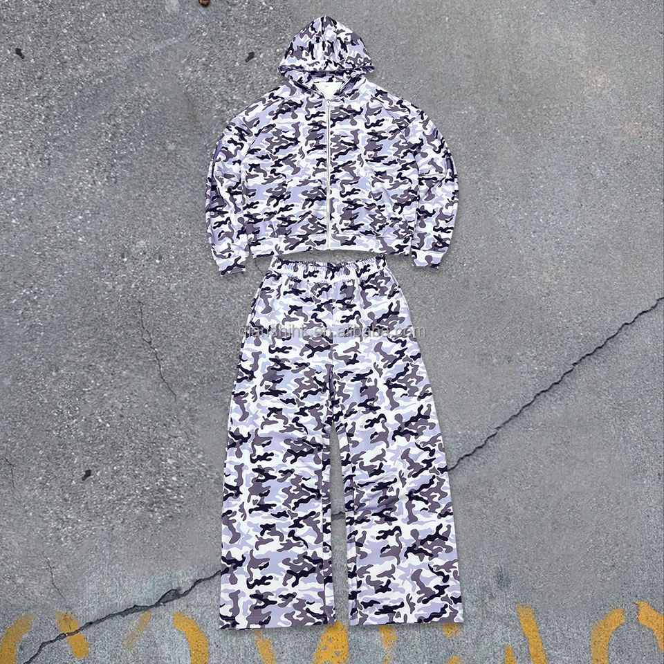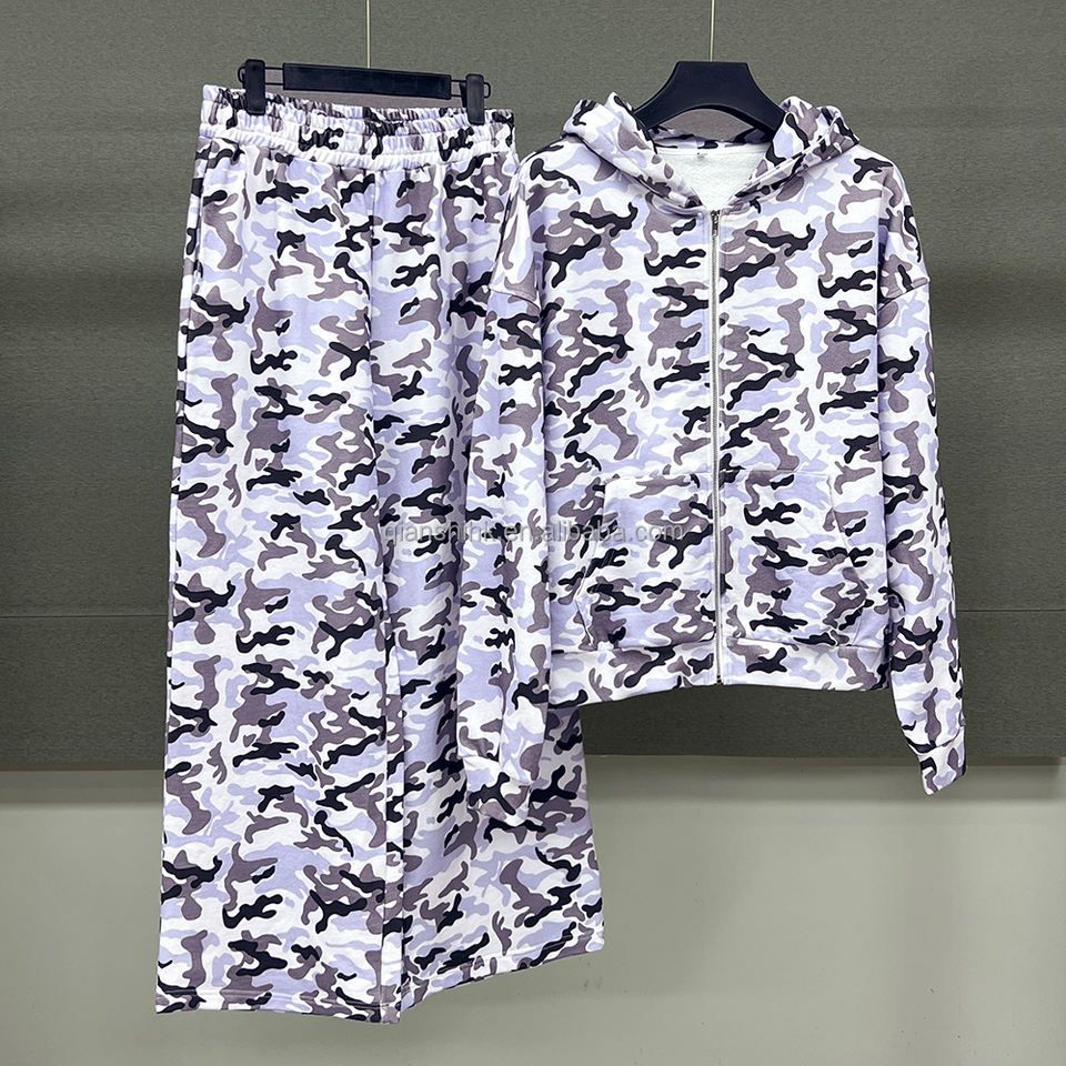 Custom Jogger Sweatsuit Unisex 2 Piece Sets French Terry Cotton Sweatpants and Zip up Hoodie Set Baggy Camo Men's Tracksuit