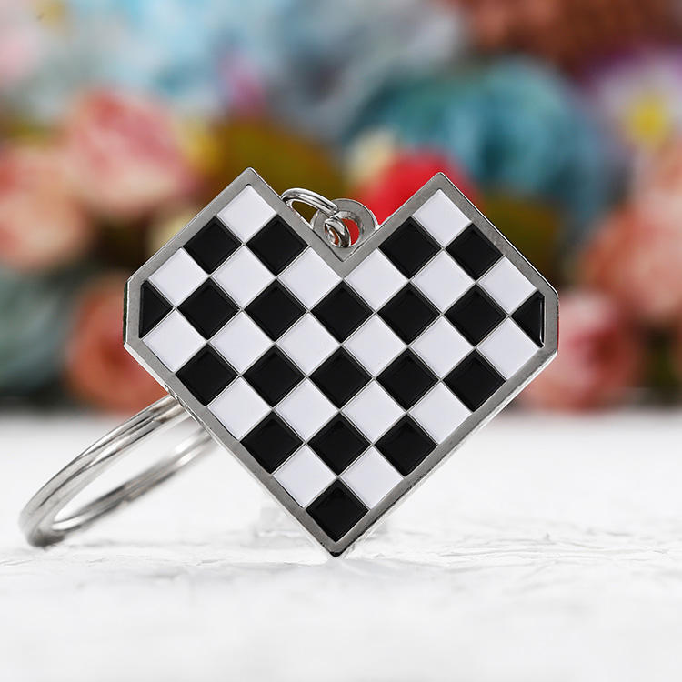 พวงกุญแจโลหะผสมสังกะสีแบบกำหนดเอง รูปหัวใจสีเงิน ลายตารางหมากรุกสีดำขาว ขายส่ง