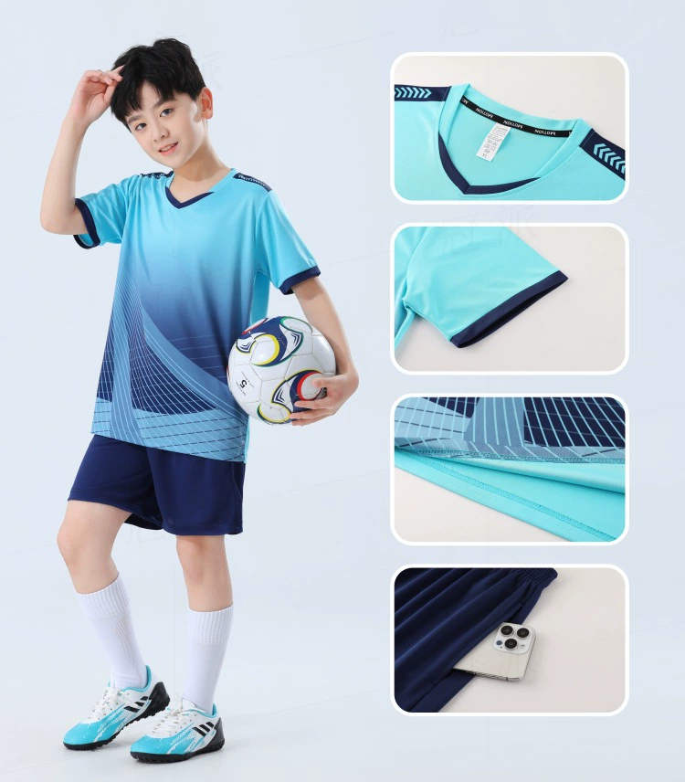 ชุดฟุตบอลเด็กแบบกำหนดเอง ชุดฝึกซ้อมคุณภาพสูง ระบายอากาศได้ดี ผลิตจากโพลีเอสเตอร์ 100% แห้งเร็ว