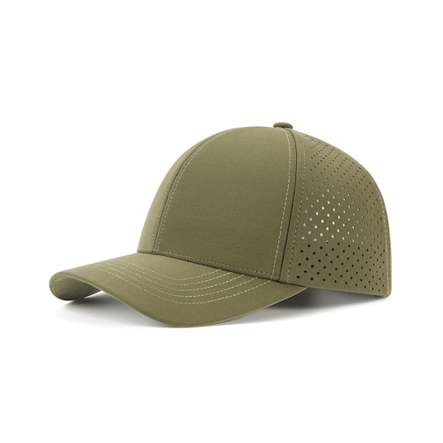หมวกเบสบอลกีฬาธนบัตร6แผงโค้งหมวกตัดเลเซอร์แบบมีรูพรุนกันน้ำโลโก้ออกแบบได้ตามต้องการ