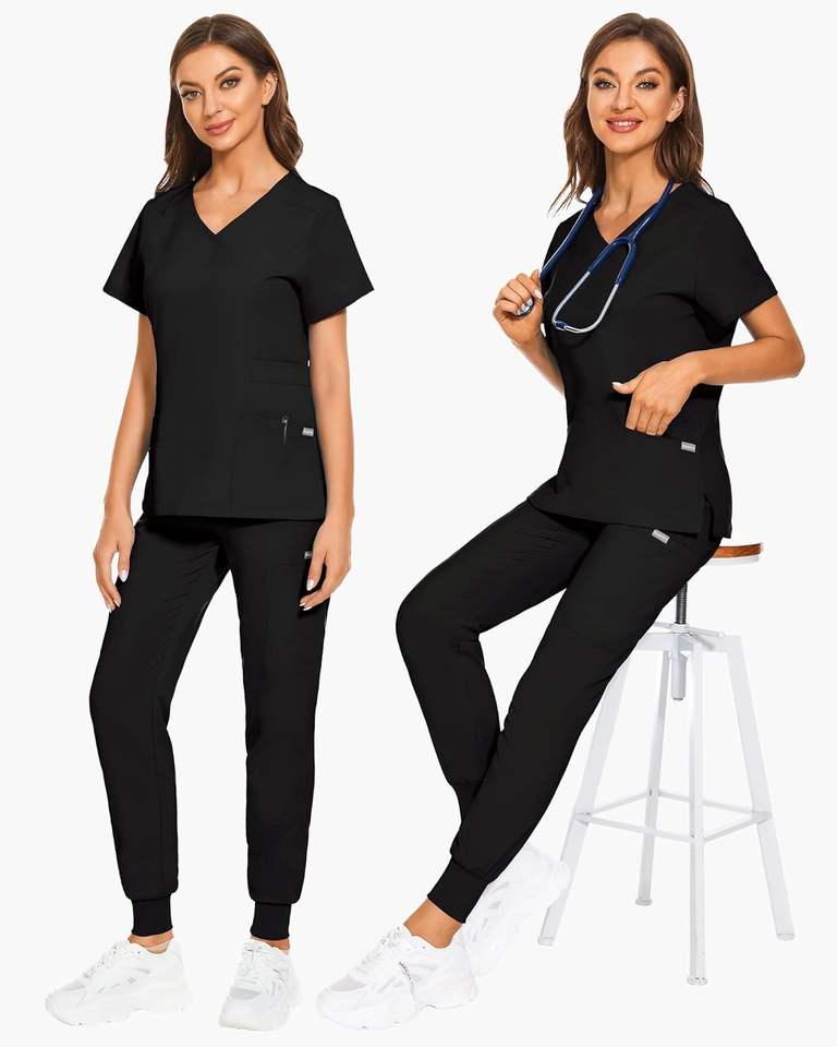 ป้ายโลโก้ที่กําหนดเองชุดขัดรอบคอชุดพยาบาลเครื่องแบบผ่าตัดยืดพยาบาลขัดเครื่องแบบผู้หญิงกางเกง Jogger ชุด