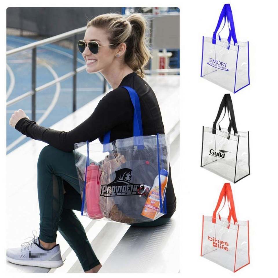 กระเป๋าพลาสติกใสขนาดใหญ่พิมพ์โลโก้ตามสั่ง กระเป๋าใสแบบมีหูหิ้วสำหรับใช้ในสนามกีฬา เหมาะสำหรับทำงานและเล่นกีฬา