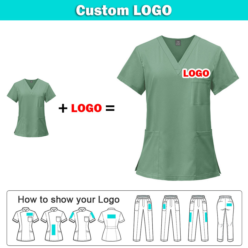 ชุดยูนิฟอร์มโรงพยาบาลแบบยืดได้ ผ้าสแปนเด็กซ์ โพลีเอสเตอร์ สำหรับบุรุษและสตรี พร้อมโลโก้สั่งทำ ชุดพยาบาลแบบสครับ ซักได้ คอวี เสื้อสครับทางการแพทย์ พร้อมเชือกผูก